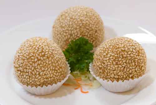 yang digoreng atau direbus dan permukaannya ditaburi/dibalur dengan biji wijen.